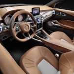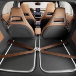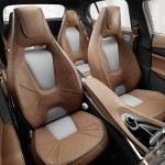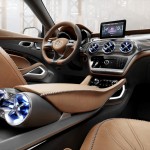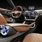 Gli interni sono in linea con lo stile delle nuove compatte Mercedes-Benz, che è stato tuttavia reinterpretato per dare vita all’abitacolo di un SUV moderno ed estremamente elegante. Dominano i rivestimenti in pelle e le superfici in alluminio scuro galvanizzato, in seducenti contrasti tra loro. I quattro sedili singoli e i pannelli centrali delle porte sono rivestiti in robusta pelle marrone che richiama l’immagine di una sella, per colore e lavorazione. Nel Concept GLA si possono, infatti, ammirare più di 20 metri di cuciture fatte a mano che tengono unite i lembi dei rivestimenti in pelle. L’analogia con la selleria è richiamata anche dai motivi impressi sui piani di seduta in pelle, che presentano al centro pregiati inserti in tela. I poggiatesta integrati dei quattro sedili sportivi sono tutti impreziositi da una modanatura illuminata, inserita nella parte aperta del poggiatesta.