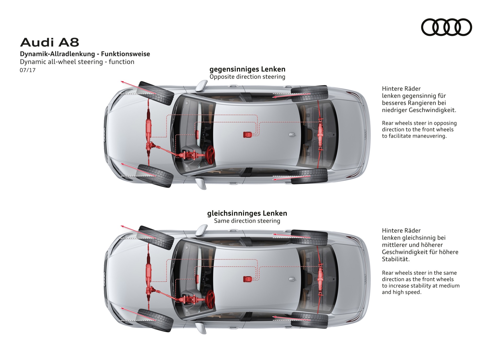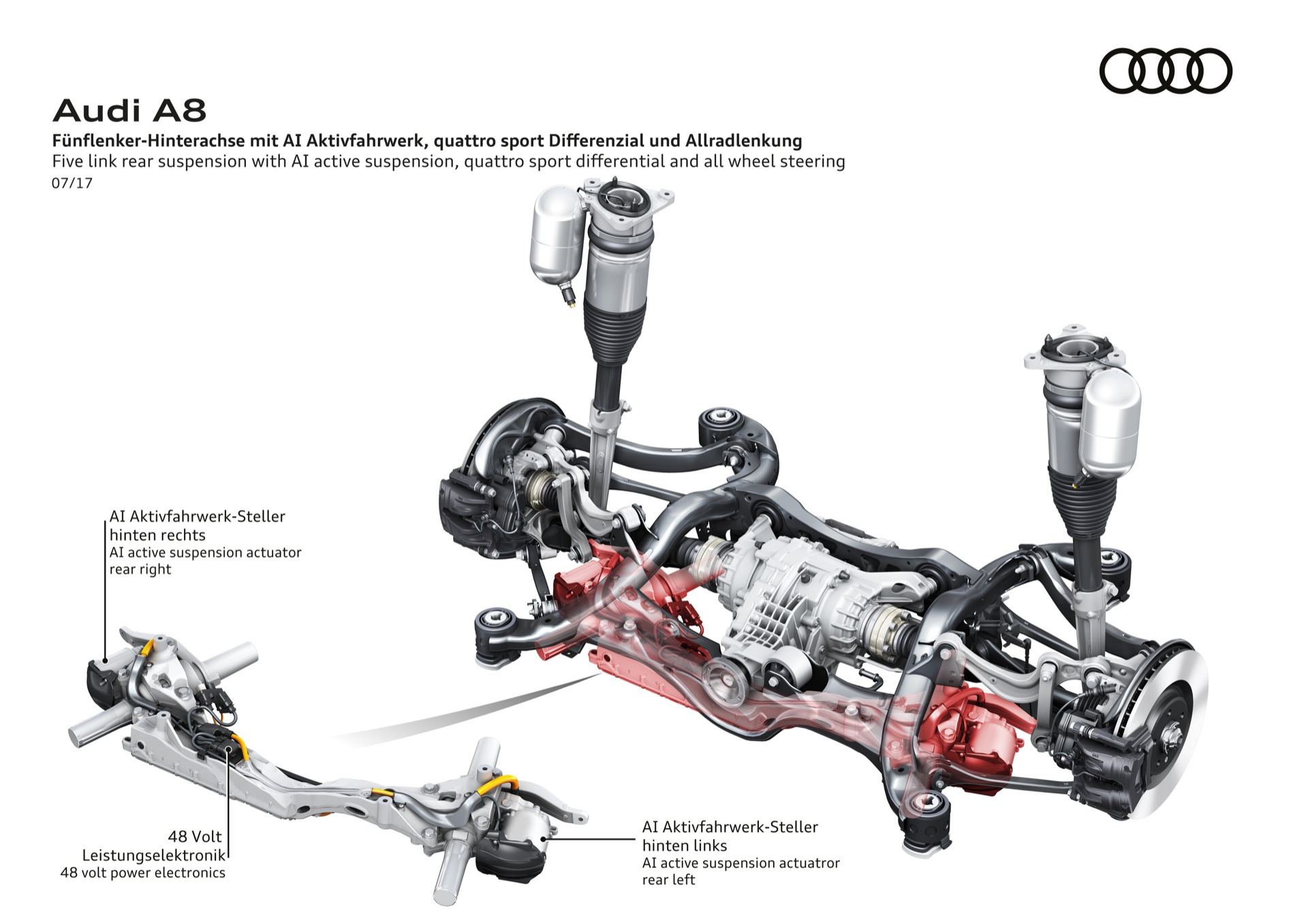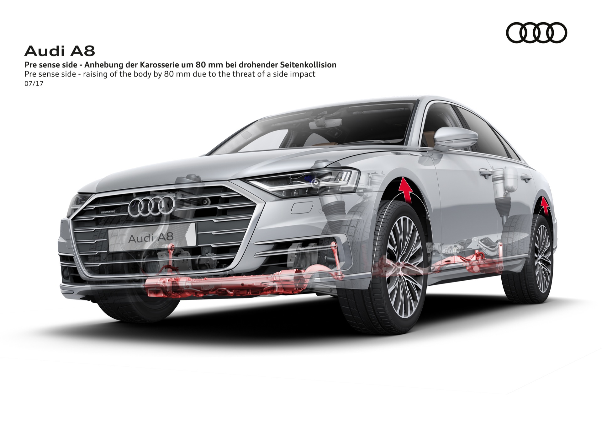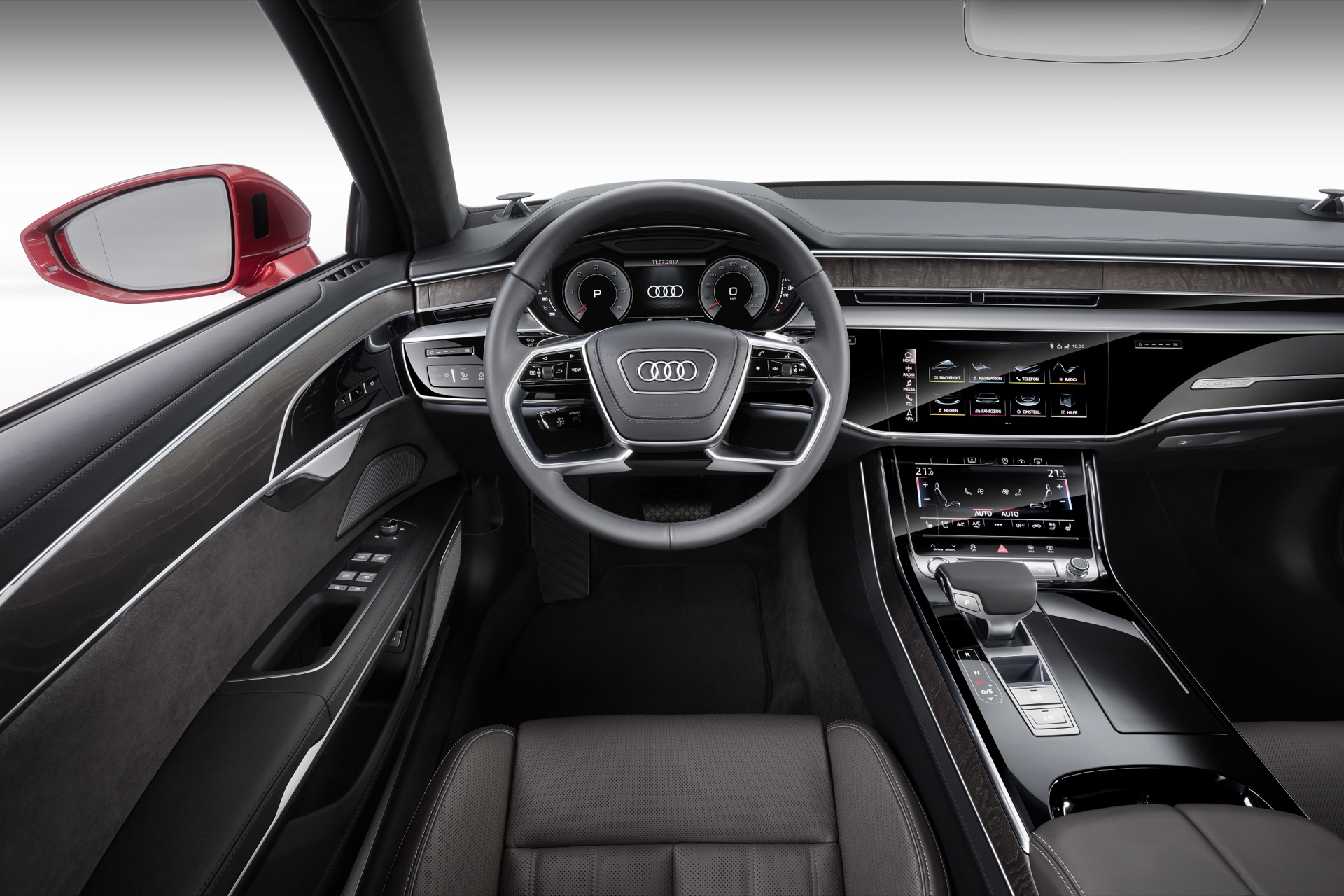 LA NUOVA AUDI A8 E’ COSTRUITA INTORNO AL SISTEMA AI, IL CERVELLONE CHE CONTROLLA OGNI FUNZIONE DELLA NUOVA SUPER AMMIRAGLIA DI INGOLSTADT. DISPONIBILE ANCHE IN VERSIONE CON PASSO LUNGO. NELLE IMMAGINI DEL SERVIZIO, LA ROSSA, COLORE CORAGGIOSO PER UN’AMMIRAGLIA, E’ LA NORMALE, LA BLACK E’ QUELLA CON IL PASSO LUNGO