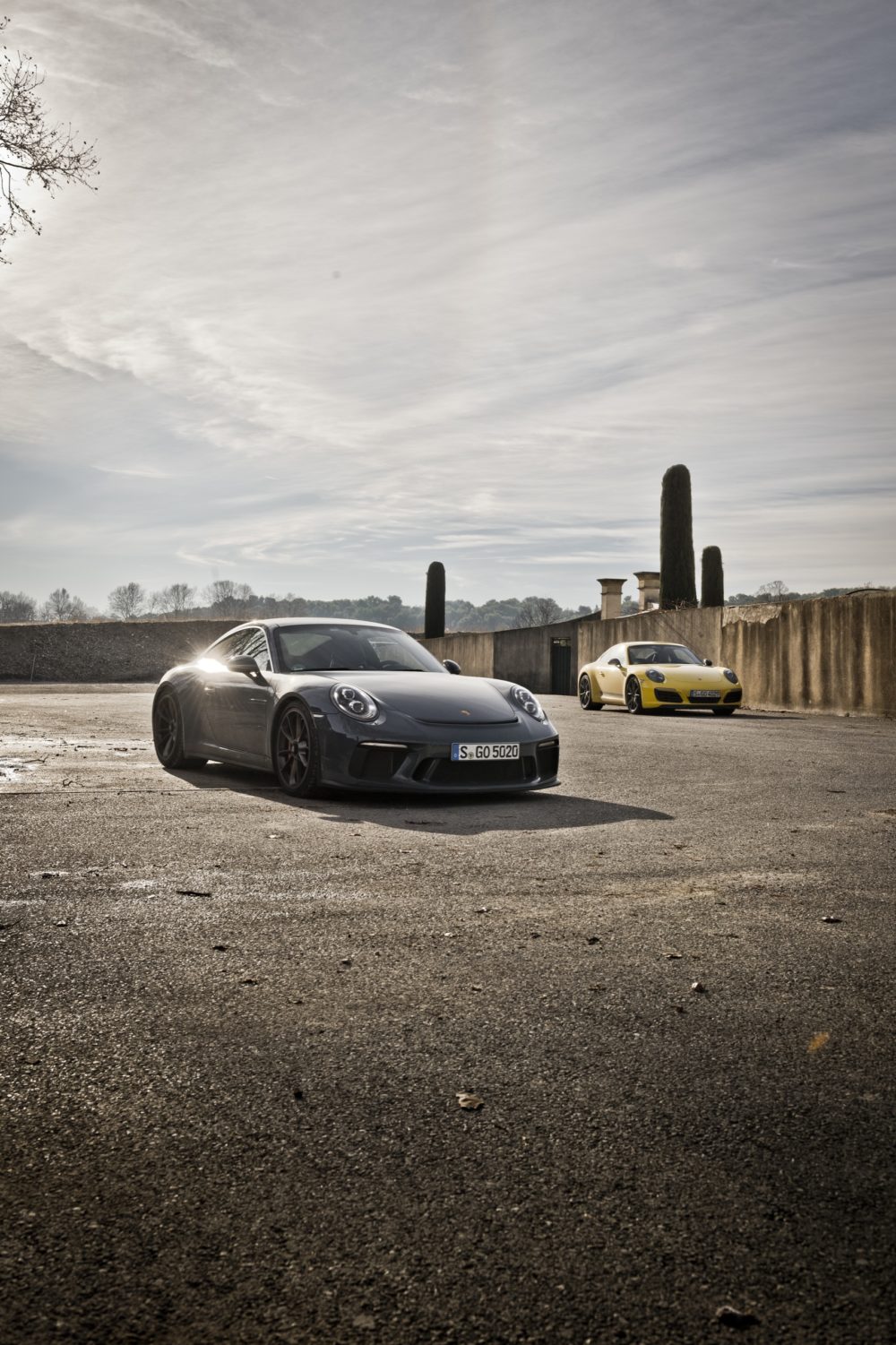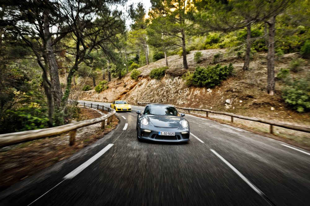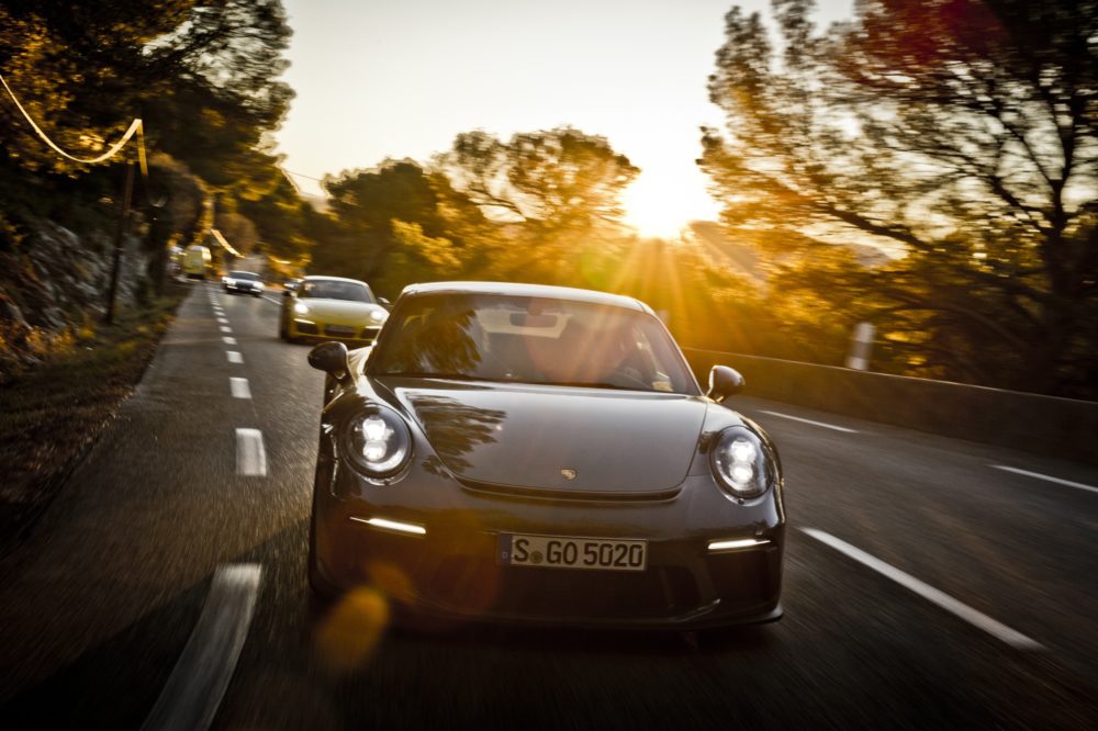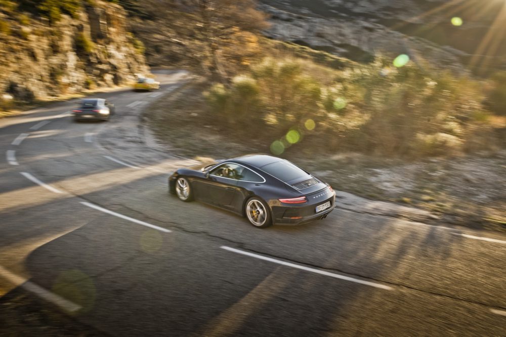 Le tre 911 della clip brillano per alcune particolarità: la 911 GT3, ad esempio, può essere equipaggiata con il Touring Package, un kit che ricorda la Carrera RS del ’73.