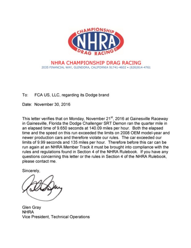 Notification letter for 2018 Dodge Challenger SRT Demon from National Hot Rod Association.