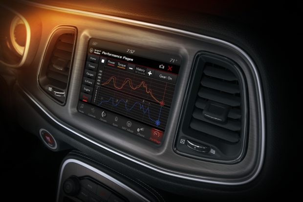 The Challenger SRT Demon’s Performance Pages feature a new real-time Dyno page, which displays instantaneous power and torque readings displayed on the 8.4-inch Uconnect touchscreen.